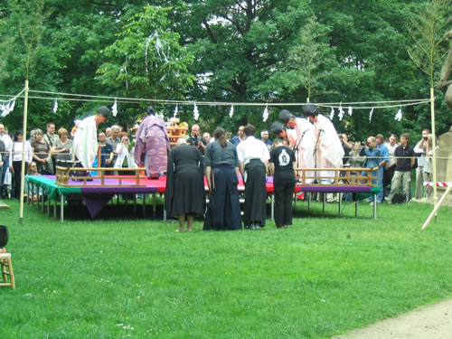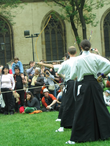 The participants in these displays all appeared to be Czech; they did not at any rate appear to be Japanese. There was a platform set up at one end of the clearing, and after the first round of games, some Japanese men took their places on the platform: