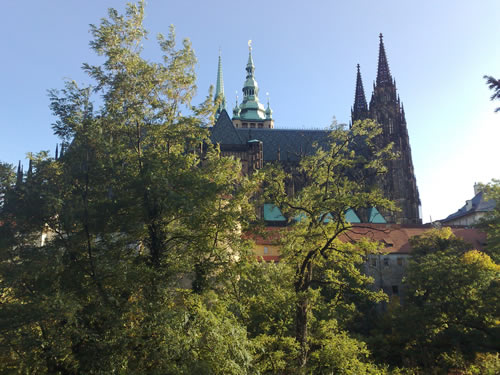 The real reason to visit Karlštejn, and particularly to take the second tour, is to visit the Chapel of the Holy Cross: it is totally amazing. The upper walls are lined with a collection of 129 panel paintings dating back to the 14th century, collection by Master Theodoric. The lower walls are encrusted with gold and precious and semiprecious stones. The altar is separated from the rest of the chapel by a screen; on the altar are replicas of the the crown, scepter and orb from the Czech crown jewels (which I had missed seeing in April). We weren’t allowed to take pictures, of course, but the virtual tour on the castle website gives something of the feel.